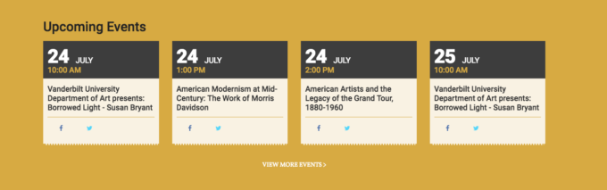 - Calendar page – Pulls in a list of events from events.vanderbilt.edu.